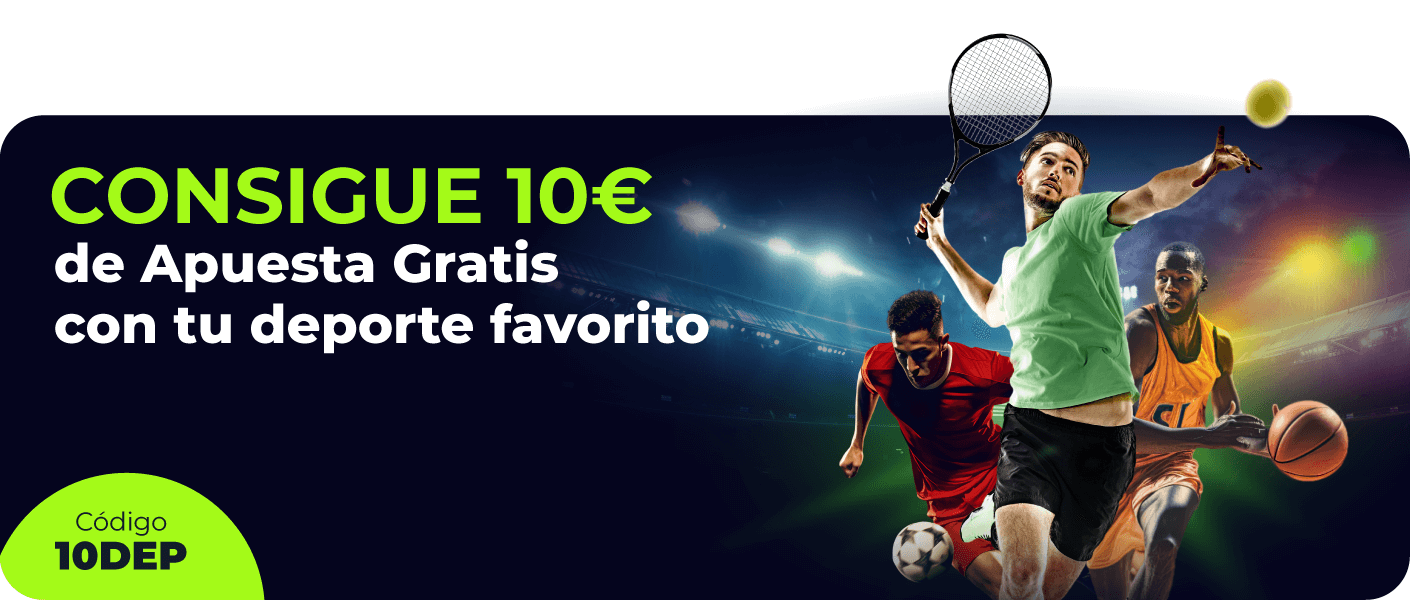 - Para participar en esta promoción y recibir una apuesta gratis de 10€ y 5 Tiradas Gratis, el usuario tendrá que haber hecho un depósito de 30€ o más con el código promocional 10DEP y hacer una apuesta prepartido o en vivo en cualquier encuentro deportivo con valor de 30€ durante el período promocional