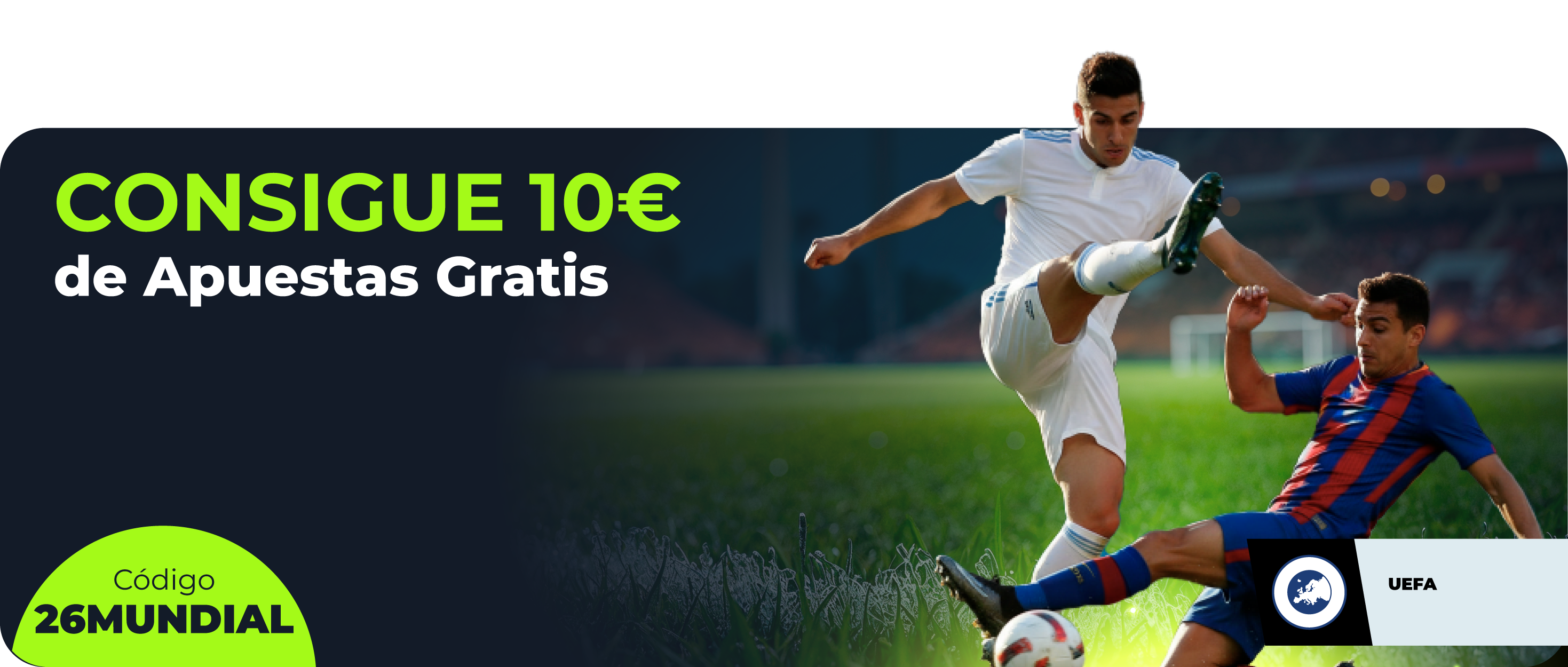 Para participar introduce el código 26MUNDIAL al realizar tu depósito de 30€ o más en YoSports. Después realiza una apuesta simple o prepartido de 30€ en los partidos de Eliminatorias Europeas para la Copa Mundial de la FIFA 2026. Al completar los pasos, recibirás 10€ en Apuesta Gratis para utilizar en mercados de LaLiga 2.