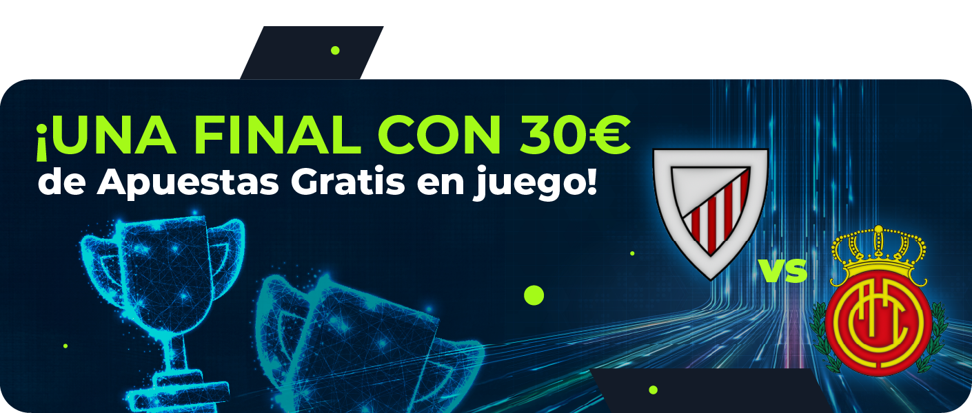 Realiza una apuesta simple pre-partido de 30€ o más, con cuota mínima 1.8, en el encuentro final de Copa del Rey entre el Athletic Club vs Mallorca, que tiene lugar este sábado 6 de abril a las 22:00h, y si ocurre cualquiera de los siguientes sucesos te llevas Apuesta Gratis: