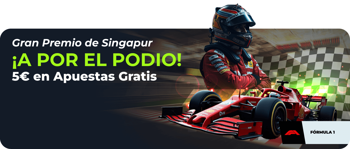 Haz una apuesta de al menos 10€ al ganador de la carrera del Gran Premio de Singapur de Fórmula 1 del domingo 05 de octubre, y si pierdes tu apuesta, pero tu piloto seleccionado termina en la segunda o tercera posición del podio, te damos 5€ en Apuestas Gratis.