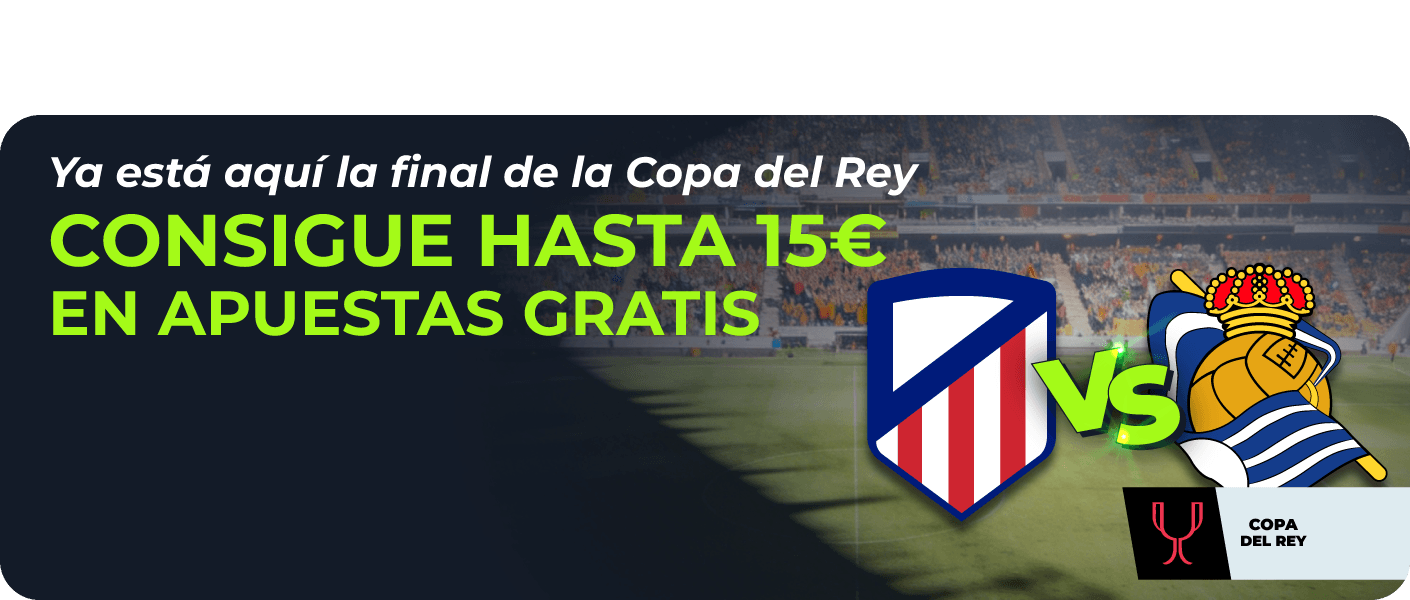 Tendrás que hacer una apuesta simple prepartido de 20€ o más con cuota mínima de 1.80 en el partido Atlético de Madrid vs Real Sociedad de este sábado 18 de abril a las 21h. Llévate 5€ de Apuesta Gratis por cada uno de los siguientes sucesos si ocurren durante los 90 minutos de partido: