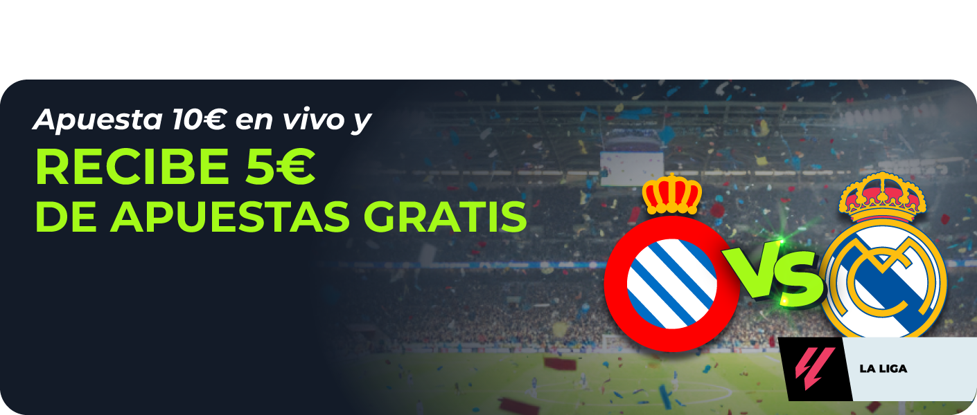 Realiza una apuesta simple o combinada de 10€ o más en vivo, con cuota mínima de 2.00 en el partido de La Liga RCD Espanyol vs Real Madrid y una vez finalice la promoción, se te adjudicarán los 5€ de Apuestas Gratis.