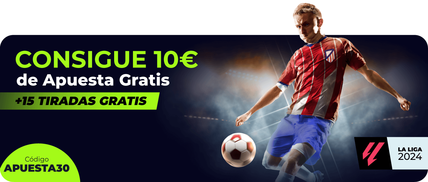 Para participar en esta promoción y recibir una apuesta gratis de 10€, el usuario tendrá que haber hecho un depósito de 30€ o más con el código promocional APUESTA30 y hacer una apuesta en cualquier evento deportivo de La Liga con valor de 30€ durante el período promocional.