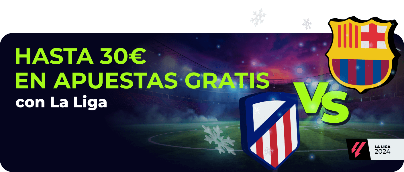 Apuestas elegibles para la promoción: Apuestas simples prepartido de 30€ o más. Cuota mínima 1.80. Apuestas realizadas en el evento Barcelona vs Atlético de Madrid del 21 de diciembre de 2024 a las 21:00hrs. Sólo se tendrán en cuenta las apuestas que se hayan realizado en el periodo de la promoción.