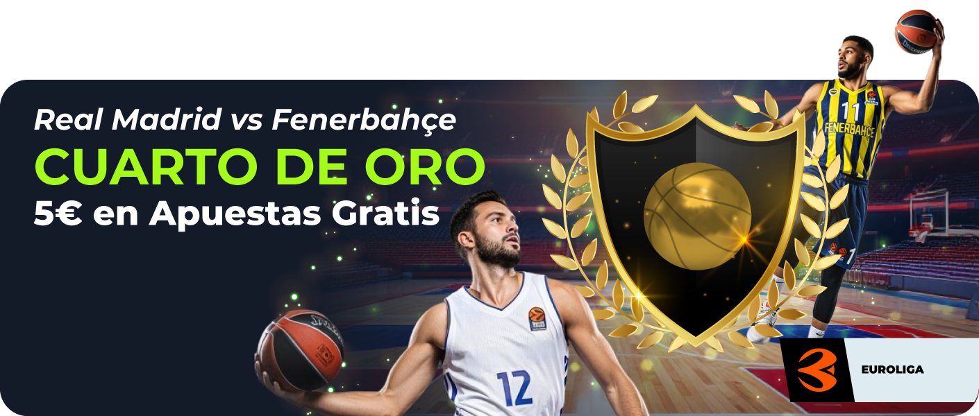 Haz una apuesta simple, prepartido de 20€ o más al ganador* del partido Real Madrid vs Fenerbhçe del 30 de octubre a las 20:30 hrs, y si el equipo que eliges gana el primer cuarto pero pierde el partido, te damos 5€ en Apuestas Gratis.