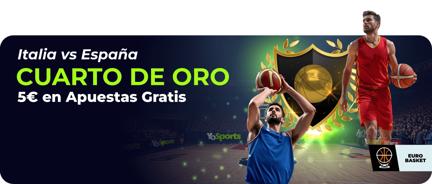 Para participar en esta promoción y recibir una Apuesta Gratis de 5€, el usuario tendrá que haber hecho una apuesta apuesta simple y prepartido de 10€ o más en el mercado "Prórroga incluida" durante el período promocional en el partido Italia vs España (Eurobasket) que se celebrará el 2 de septiembre a las 20:30 hrs.