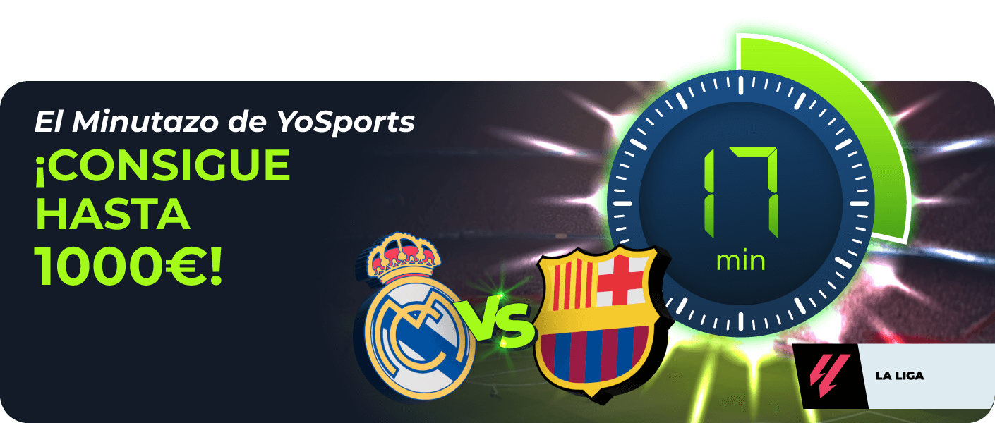- Para participar en esta promoción y optar a ganar parte del bote de 1.000€ en premios, el usuario deberá ser un usuario nuevo o un usuario existente que no haya realizado su primer depósito en YoSports, luego tendrá que realizar un primer depósito mínimo de 10€ con decimales durante el periodo promocional. El decimal del depósito representará el minuto en que el usuario cree que se anotará el primer gol del partido Real Madrid vs Barcelona del 26 de octubre de 2025 a las 21:00 hrs. Ejemplo: Un depósito de 10,49€ indica que el usuario predice el gol en el minuto 49. Finalmente, tendrá que realizar una apuesta de 10€ o más en cualquier mercado deportivo (cuota mínima 1.80, prepartido, simple o combinada).