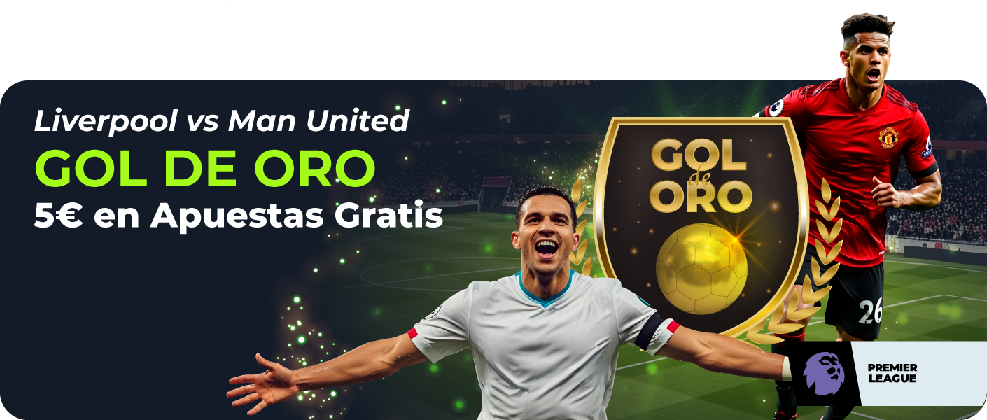 Haz una apuesta apuesta simple y prepartido de 10€ o más al mercado "Ganador del partido" en el encuentro Liverpool vs Manchester United de este domingo en la Premier League, y si tu equipo seleccionado marca el primer gol pero pierde o empata el partido te llevarás 5€ en Apuestas Gratis.