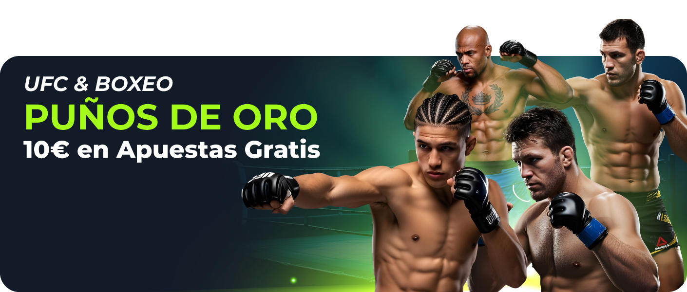 a una de estas peleas:Tom Aspinall vs. Ciryl Gane del sábado 25 de octubre a las 16:30h o Sebastián Fundora vs. Keith Thurman del domingo 26 de octubre a las 02:00h y si el peleador por el que has apostado pierde la pelea, te regalamos 10€ en Apuestas Gratis. mercado "UFC y BOXEO". - Solo serán aceptadas las apuestas realizadas antes del inicio del combate.