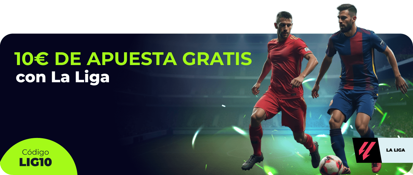 Para participar en esta promoción y recibir una apuesta gratis de 10€, el usuario tendrá que haber hecho un depósito de 10€ o más con el código promocional LIG10 y hacer una apuesta prepartido o en vivo en cualquier evento de La Liga, con valor de al menos 10€ durante el período promocional.