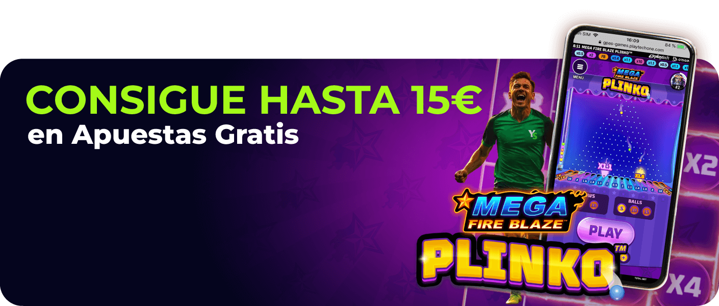 ✔️ Nivel 2: Deposita y juega 20€ en Mega Fire Blaze Plinko y conseguirás 10€ de Apuesta Gratis.