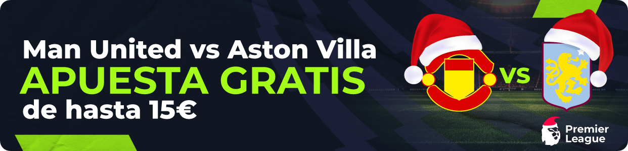 Realiza al menos una apuesta de 25€ con cuota mínima 1.5 (Prepartido, no en vivo) en el partido entre Manchester United y Aston Villa del 26 de diciembre en La Premier League, y si ocurre cualquiera de los siguientes sucesos, te puedes llevar hasta 15€ en Apuestas Gratis y hasta 30 Tiradas Gratis en la slot Santa's Wonderland: