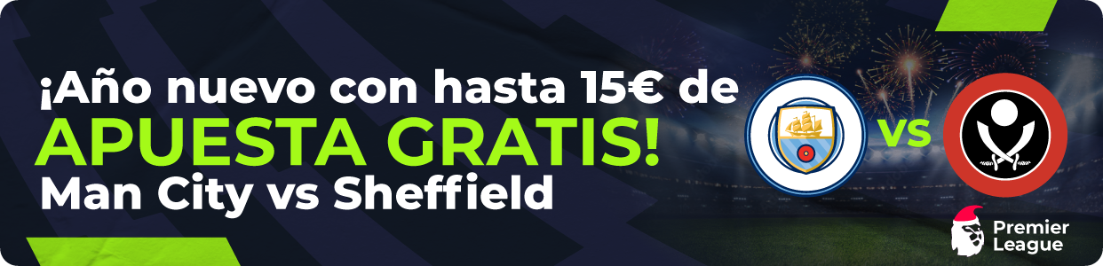 Realiza al menos una apuesta simple de 25€ con cuota mínima 1.5 (Prepartido, no en vivo) en el partido entre Manchester City vs Sheffield United del 30 de diciembre, a las 16:00h, en La Premier League y si ocurre cualquiera de los siguientes sucesos, te puedes llevar hasta 15€ en Apuestas Gratis.
