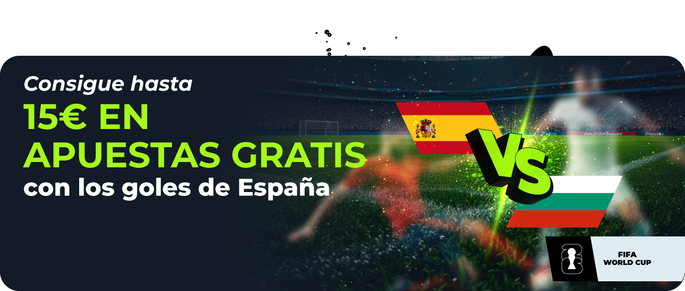 Apuesta al resultado correcto del partido España vs Bulgaria y recibe 5€ por cada gol de España hasta un máximo de 15€ en Apuestas Gratis.