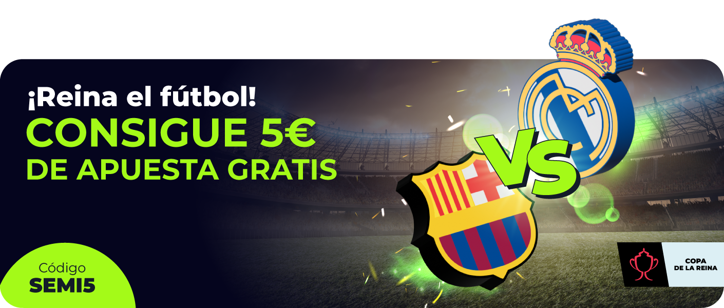Para participar en esta promoción y recibir una apuesta gratis de 5€, el usuario tendrá que haber hecho un depósito de 20€ o más con el código promocional SEMI5 y hacer una apuesta prepartido o en vivo en el partido Real Madrid vs Barcelona de las semifinales de La Copa de la Reina con valor de al menos 20€ durante el período promocional.