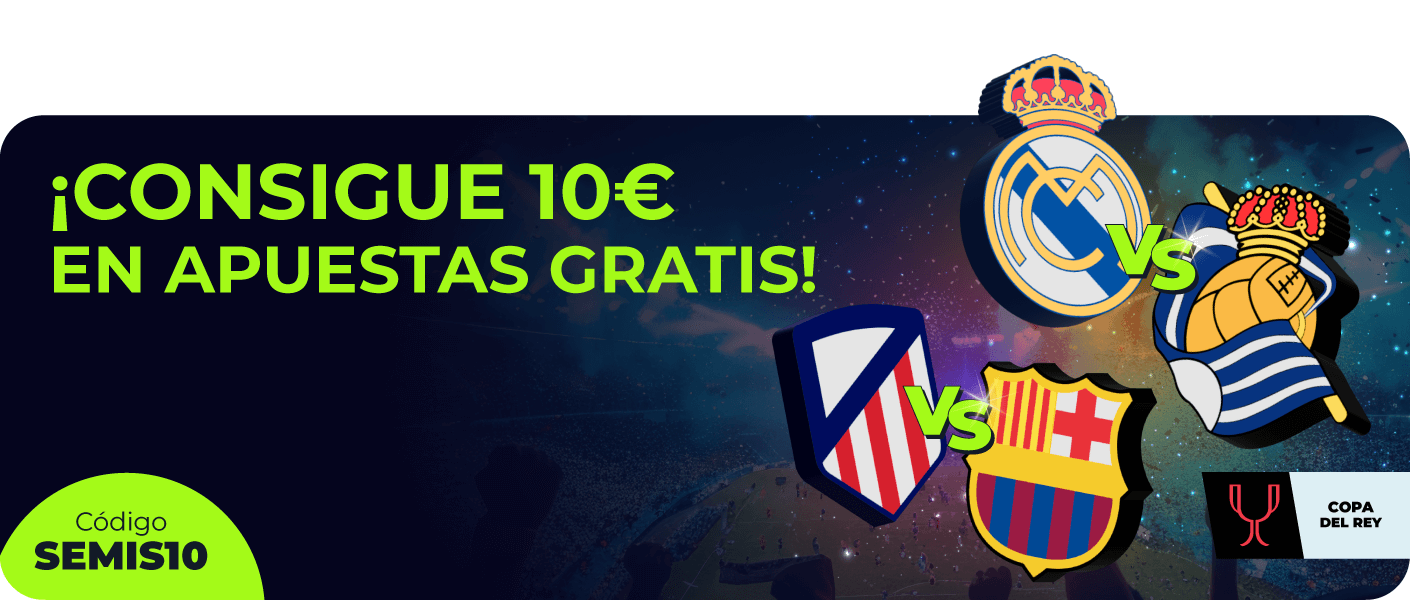 Para participar en esta promoción y recibir una apuesta gratis de 10€, el usuario tendrá que haber hecho un depósito de 30€ o más con el código promocional SEMIS10 y hacer una apuesta prepartido o en vivo en los partidos de las semifinales de la Copa del Rey (Real Madrid vs Real Sociedad del martes 1 de abril a las 21:30h y/o en el partido del Atéltico de Madrid vs FC Barcelona del 2 de abril a las 21:30h), con valor de al menos 30€ durante el período promocional.