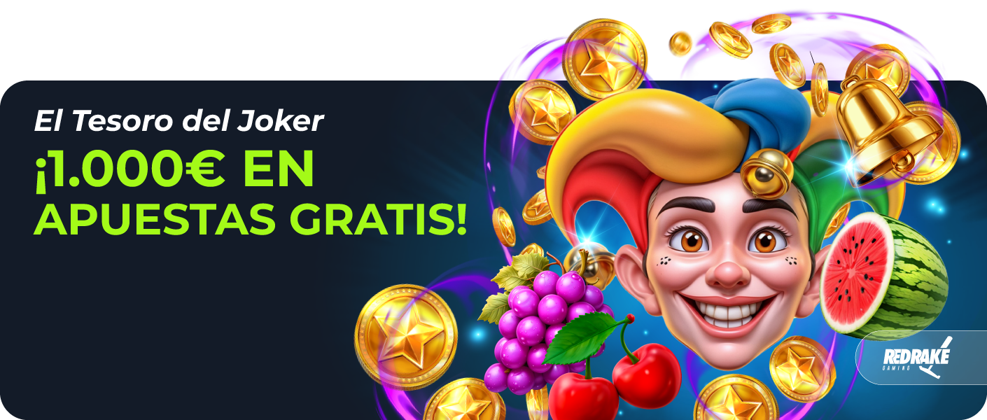 Del 2 al 8 de marzo celebramos con El Tesoro del Joker, nuestro torneo de Red Rake. Durante toda la semana repartiremos 1.000€ en Apuestas Gratis entre los jugadores que consigan las mejores posiciones en la clasificación. Para participar inscríbete aquí: