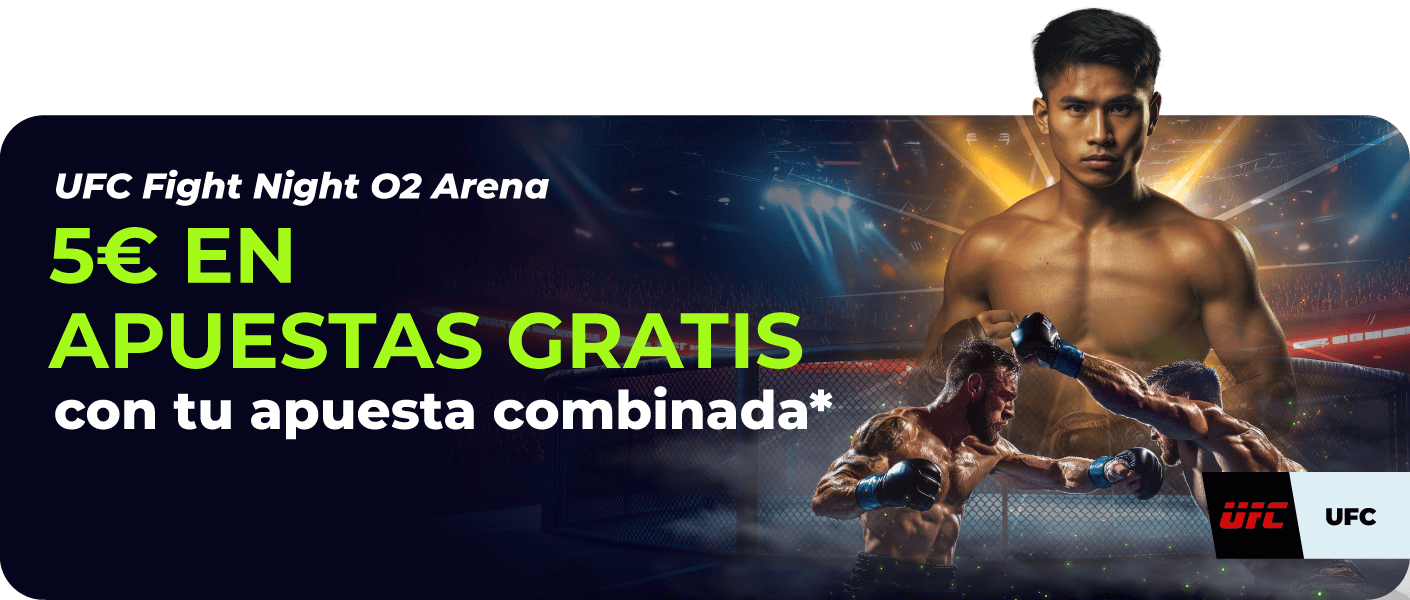 Para participar en esta promoción y recibir una Apuesta Gratis de 5€, el usuario tendrá que haber hecho una apuesta combinada de 3 o más selecciones, prepartido o en vivo, con cuota de 3.00 o superior en los eventos de la UFC.
