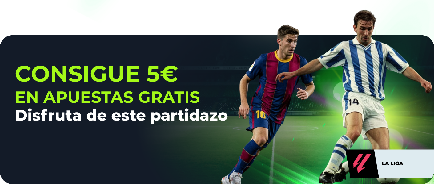 Después, realiza una apuesta pre-partido de 10€ o más en el YoPartidazo entre Real Sociedad y FC Barcelona que se disputará el 18 de enero del 2026 a las 21.00h. A cuota mínima 1.80 o superior y cuando sea determinada, recibirás 5€ en Apuestas Gratis.