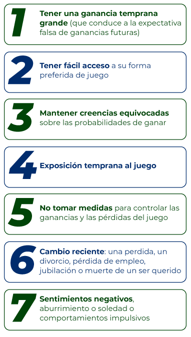 El contacto o la participación precoces en juegos de azar y apuestas (sobre todo cuando una persona muy joven consigue un premio temprano), una personalidad impulsiva o poco dada al autocontrol, jugar más de lo pensado inicialmente (especialmente con el fin de recuperar pérdidas) o no respetar el gasto máximo que se había decidido previamente, por ejemplo, son algunos de estos factores.